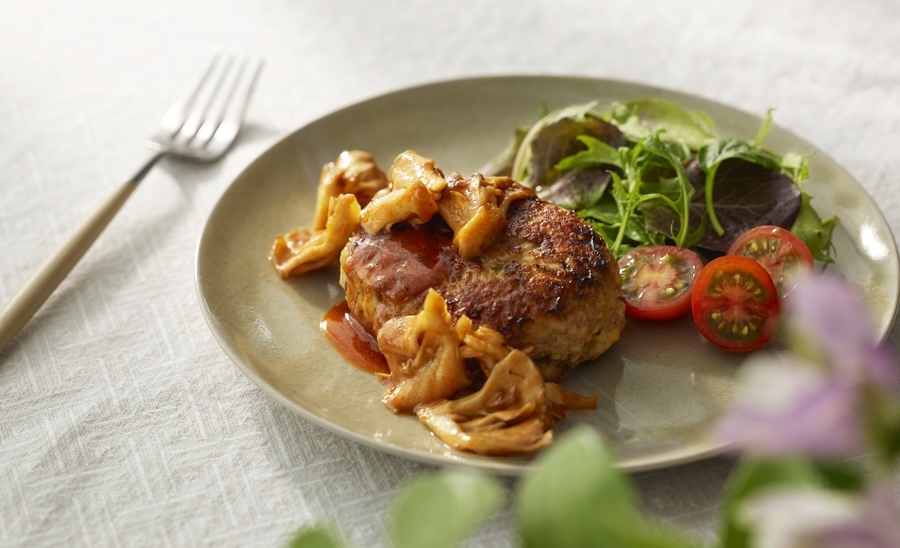 豚ひき肉は一人分100gで、十分にたんぱく質を摂ることができます。舞茸と玉ねぎは細かく刻んで、ハンバーグのたねを整形する際にしっかり混ぜ合わせましょう。また、付け合わせのソースにも舞茸を使います。舞茸の食感で、食べ応えと満足感を得られます。さらに、低カロリーでたんぱく質と食物繊維を一緒に摂ることができます