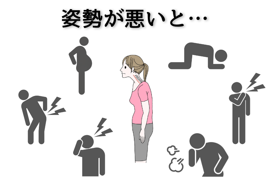 姿勢の崩れは痛みや見た目だけでなく、体の機能も低下させるリスクがあります。