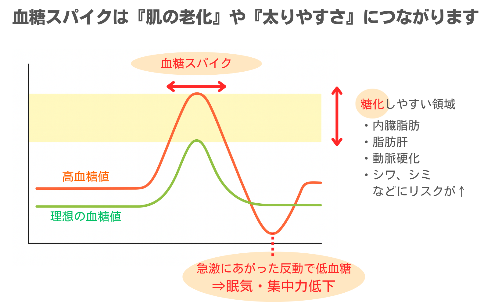 血糖値は食後約30分~1時間で上昇しますが、食後の短時間で血糖値が急上昇・急降下することを血糖スパイクといいます。血糖スパイクを起こすと、インスリンが大量に分泌されます。インスリンは余った糖を脂肪に変えて蓄える働きがあるため、結果的に太りやすい体質につながります。