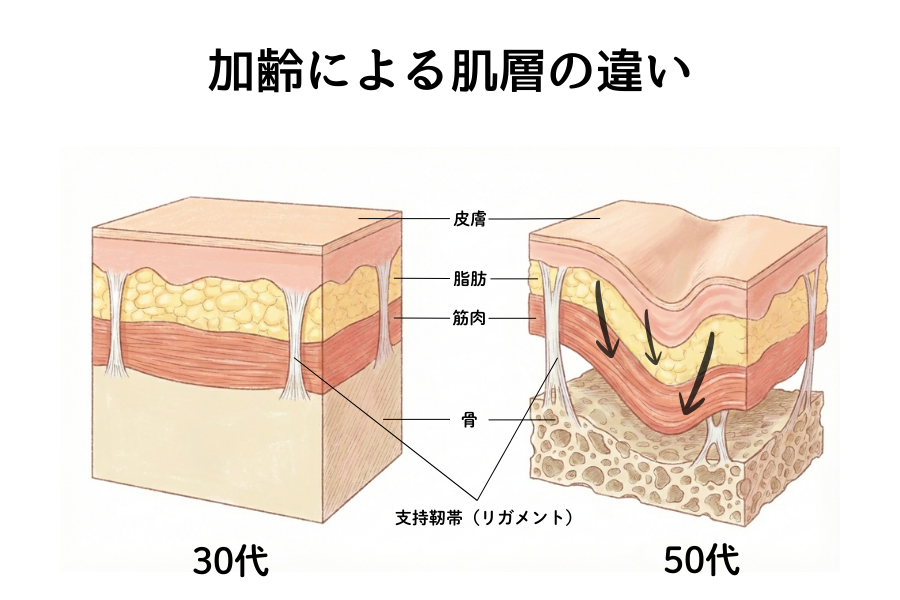 - 40代:長年の重力の影響で、支持靭帯(リガメント)も緩んでいき、支えを失った脂肪の層が下へ滑り落ちてしまいます。これが、頬の高さが下がったり、フェイスラインがもたついたりする大きな原因です。