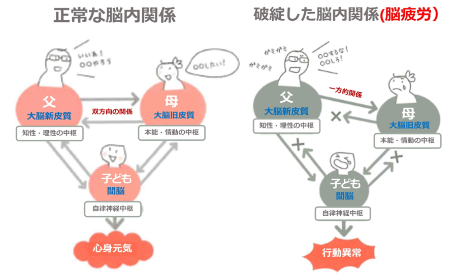 本来、この二つは双方向で良好なコミュニケーションを取ることで、脳は正常に機能します。しかし、スマートフォンによる情報の過多や複雑な人間関係、働き過ぎなどが要因により、大脳新皮質がキャパシティを超えてしまい、大脳旧皮質を一方的に抑制する関係になってしまうと、脳のコミュニケーションが破綻し、脳疲労を起こしてしまうのです。