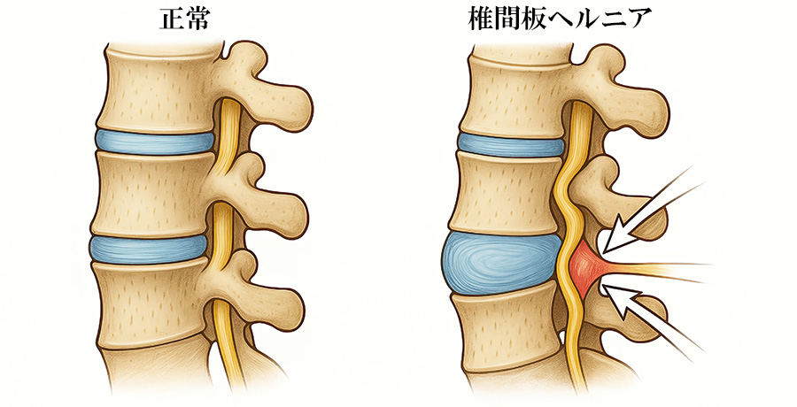 椎間板ヘルニアとは、背骨の間にあるクッション(椎間板)が変形し飛び出し神経を圧迫する状態の事です。特に腰(腰椎)や首(頚椎)に起こりやすく、最近は、20代〜30代の若い女性の間でも増加傾向にあります。