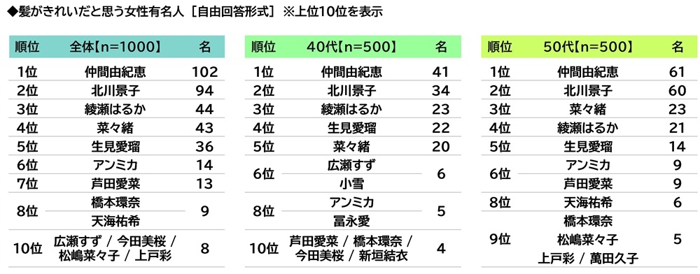 全回答者(1,000名)に、髪がきれいだと思う女性有名人を聞いたところ、1位「仲間由紀恵さん」(102名)、2位「北川景子さん」(94名)、3位「綾瀬はるかさん」(44名)、4位「菜々緒さん」(43名)、5位「生見愛瑠さん」(36名)となりました。