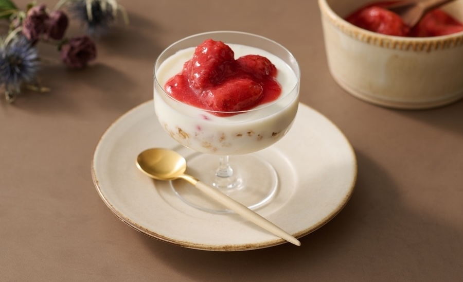 いちごコンポートを作り始めると、部屋じゅうが甘い香りに包まれます。コトコトと丁寧に煮たいちごをヨーグルトゼリーに添えれば、いつものヨーグルトが少し贅沢なデザートに早変わりします。